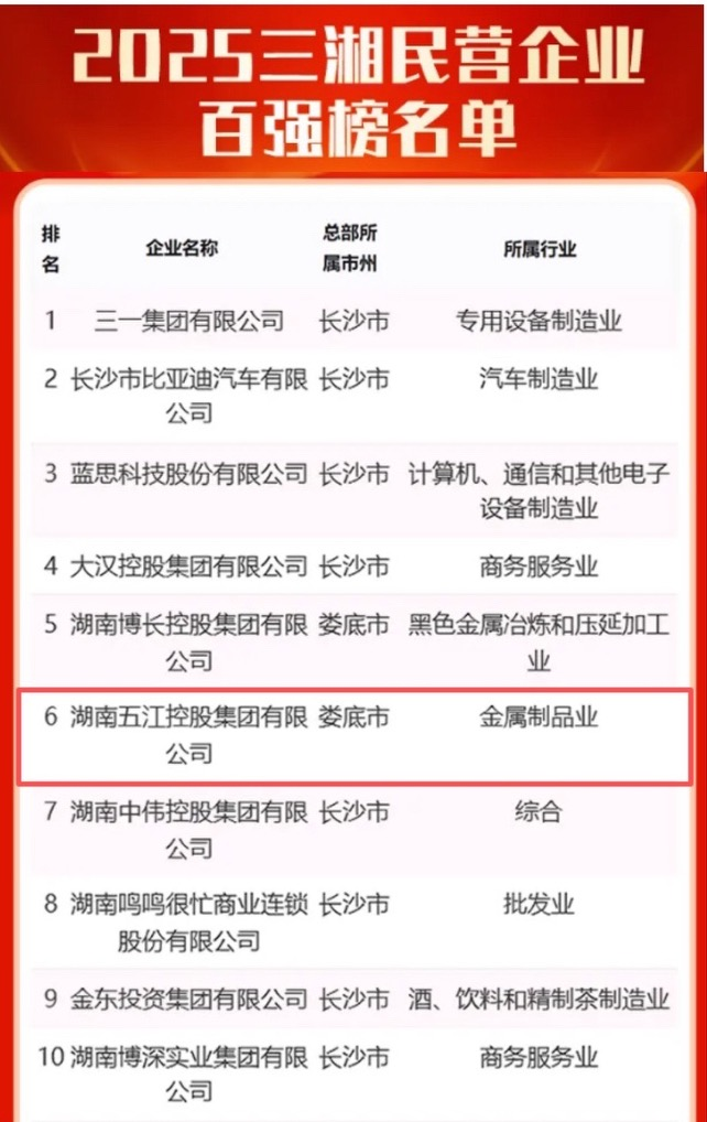 集團(tuán)榮獲2025“三湘民企百?gòu)?qiáng)榜”第6名